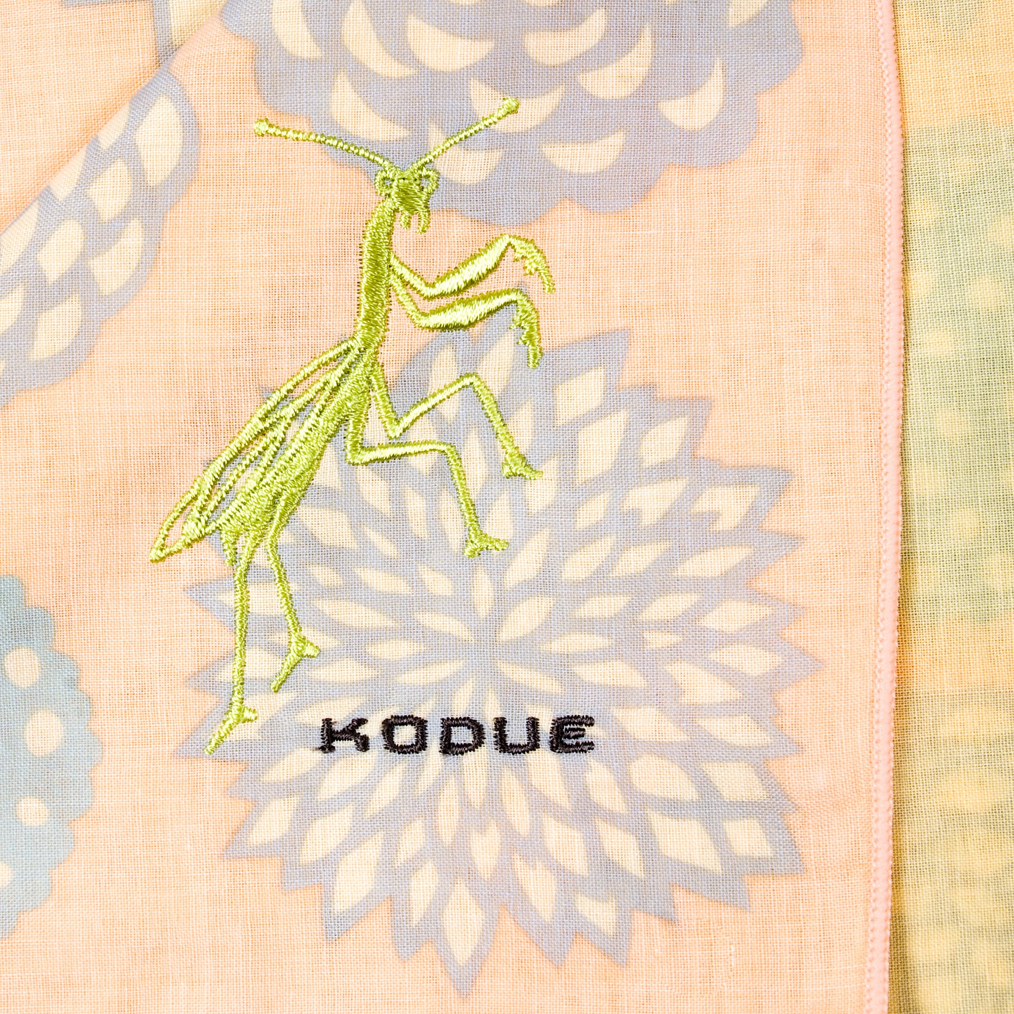 牡丹やアザミなどの定番のフラワープリントに施したのは、カマキリの刺繍!