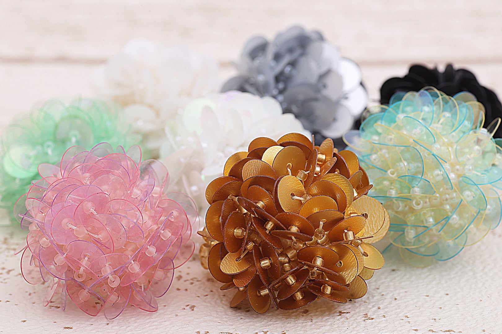 ビーズを球状に重ね合わせたゴージャスなお花リング。