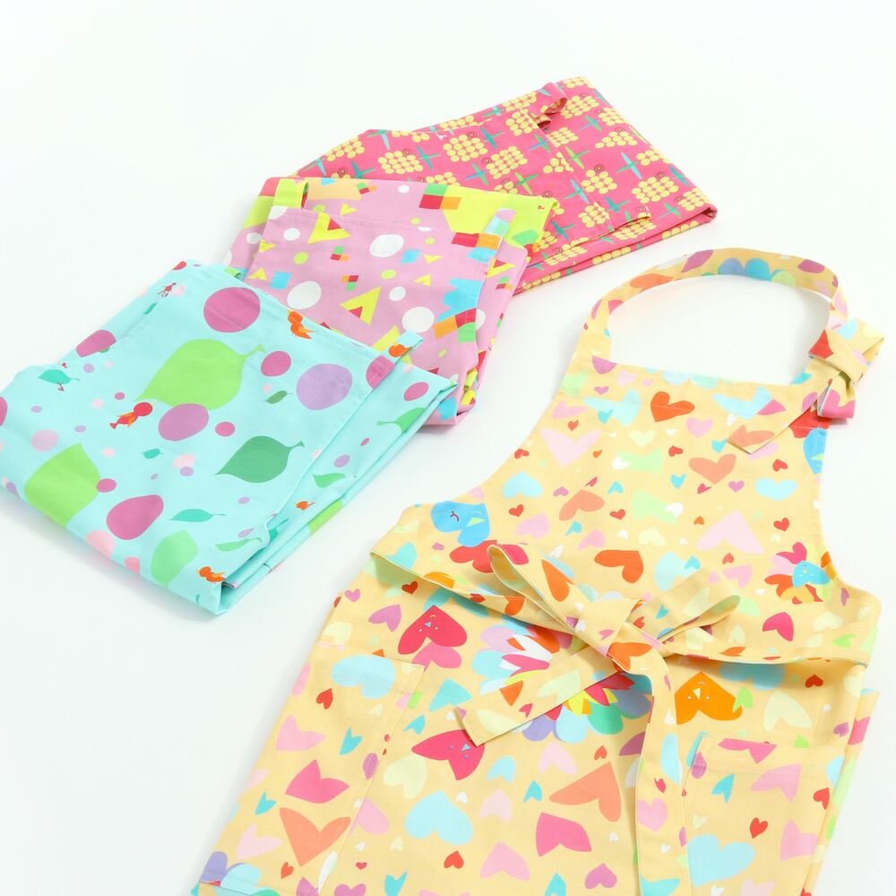 イラストレーター越野世帆里(コシノセオリ)さんによる、『日々の自分に彩りを』をコンセプトとした愛のあるアートでカラフルなエプロンです。